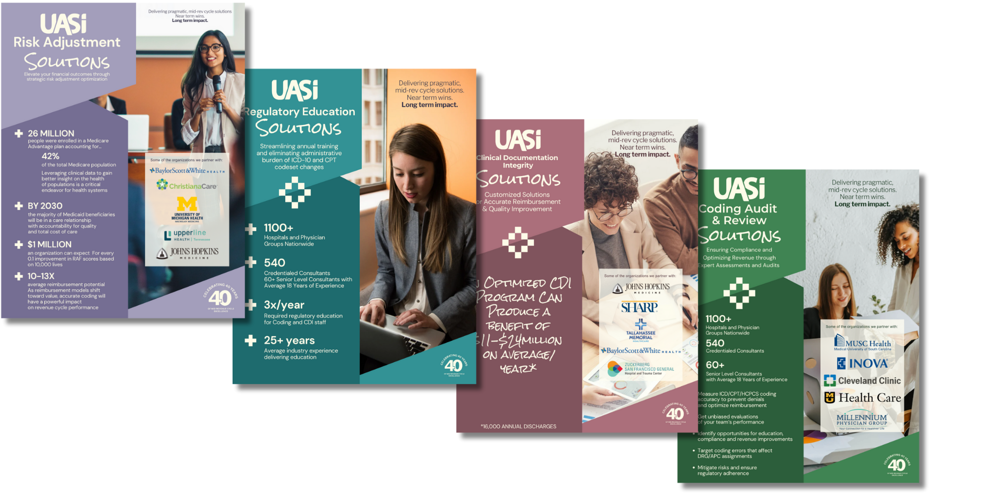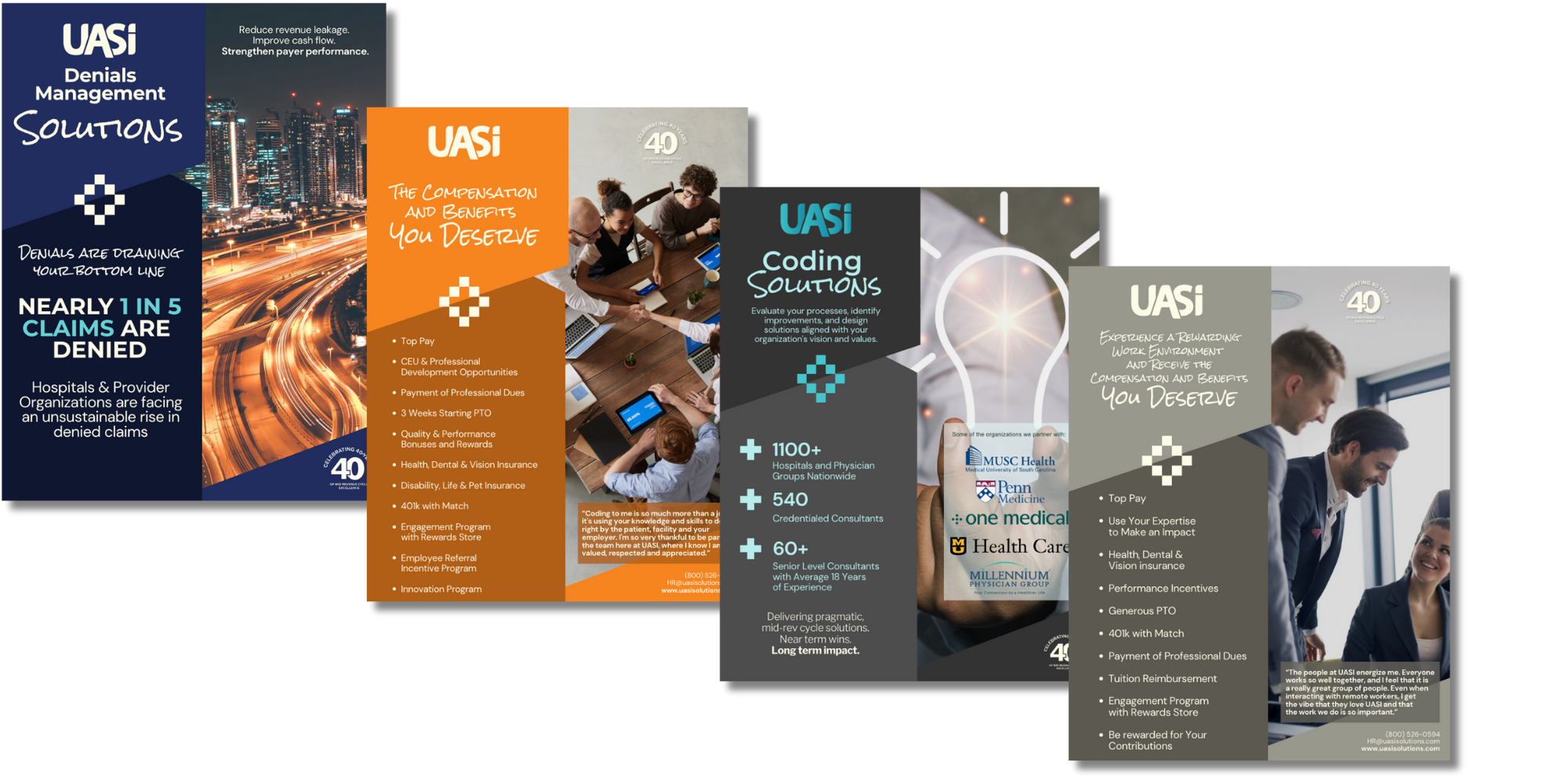 I gave UASI’s print materials a much-needed makeover, redesigning 12 sales slicks to create a cohesive, modern look that finally felt on-brand. The old versions were all over the place, so I built a clean, consistent design template that made the company shine on the tradeshow floor. For the first time, these slicks were also made digitally available in the CRM, giving the sales team easy, on-demand access to branded content. I refreshed our educational print pieces too, turning them into polished resources that showcased UASI’s expertise and reinforced its reputation as a thought leader in the healthcare mid-revenue cycle space.